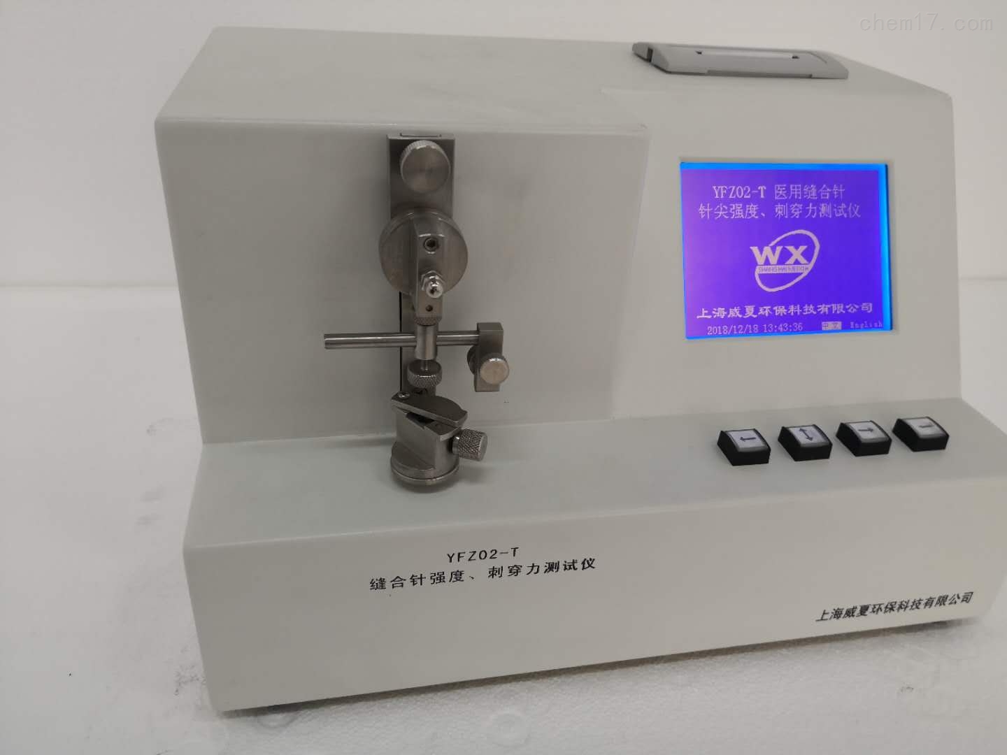 YFZ02-T醫(yī)用縫合針針灸針針尖強度、刺穿力測試儀由智能控制器、測力機構(gòu)、測距機構(gòu)、打印機等部分組成。其中智能控制器由CPU、主板、液晶顯示屏、鍵盤、電源等部分組成